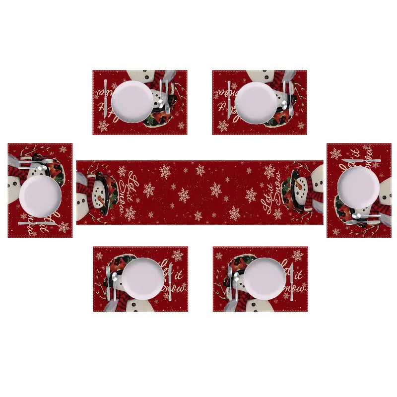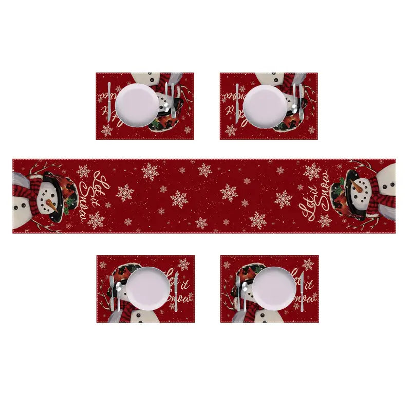 Composición del set: 1 camino de mesa + 4 manteles individuales con diseño “Let It Snow”.