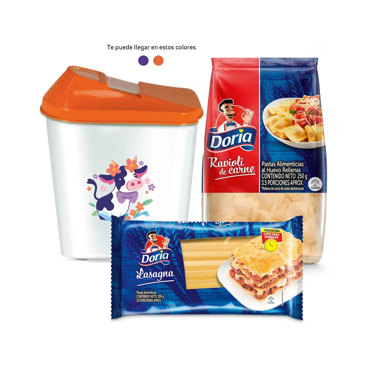 - Pack completo con: Lasagna Doria (200 g) + Ravioli de Queso (250 g) + recipiente para pastas.