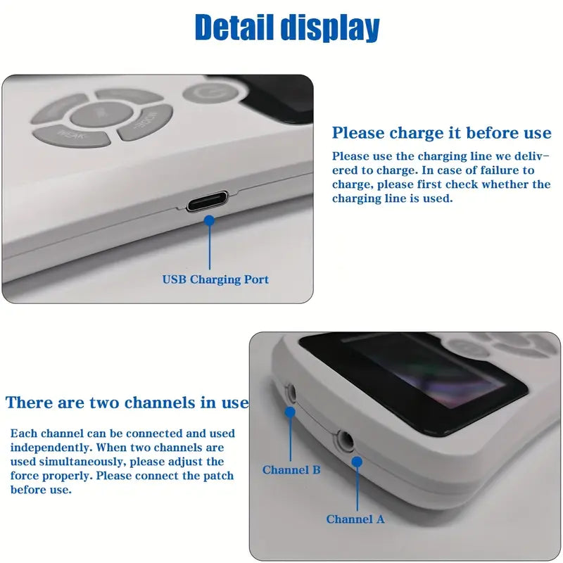 Este dispositivo es perfecto para aliviar dolores musculares, reducir la fatiga y promover la relajación en cualquier momento del día. Solo necesitas cargarlo, seleccionar tu modo y nivel de intensidad, y colocarlo en las áreas que deseas tratar. Imagina estar en tu sala, después de un entrenamiento o un día largo de trabajo, aplicando TENS Relax en tus hombros o espalda, sintiendo cómo la tensión se disuelve y la calma te invade. Es una experiencia sencilla, efectiva y agradable.