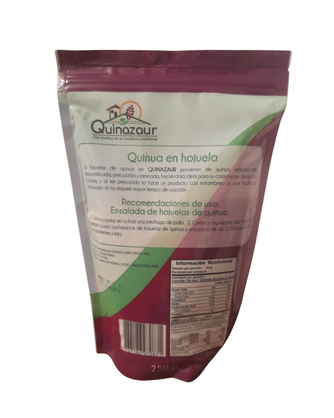 - Presentación de 250 gr de quinua en hojuelas, lista para incorporar en tus comidas.