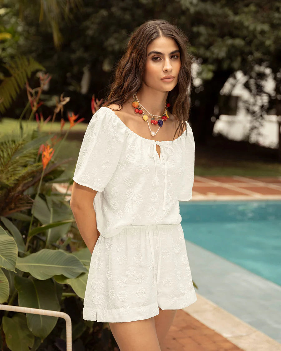 Diseñado para mujeres que buscan comodidad, estilo y versatilidad, este short corto en color blanco con estampado en relieve tipo ojalillo es la pieza que transforma tu look diario en una declaración de frescura y sofisticación. Ideal para quienes desean un atuendo ligero que se adapte a su ritmo activo, rodeadas de un ambiente soleado, en espacios urbanos o en la playa, este short satisface tu necesidad de sentirte cómoda sin sacrificar estilo. Con su toque romántico y femenino, te acompaña en momentos de relax, paseos y encuentros, haciéndote lucir radiante y segura de ti misma.
