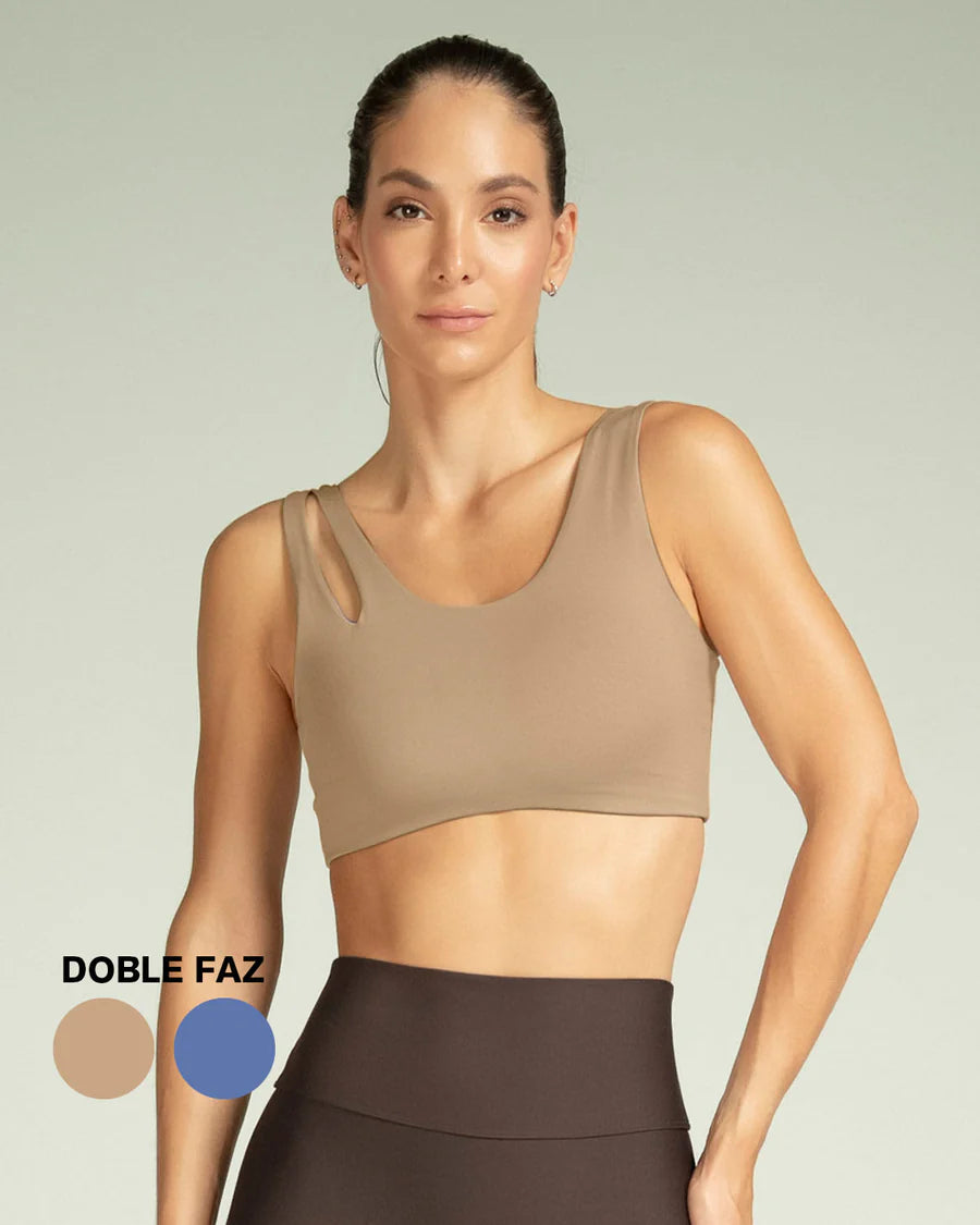 Imagina una mañana de yoga en el parque, con el sol brillando y tu top doble faz que se adapta perfectamente a cada postura, dándote libertad y estilo.